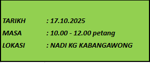 TUJUAN Kluster NADI Nabawan dijemput untuk mengikuti program ini bersama warga Pensiangan. Tujuan program ini adalah untuk membantu mengeratkan hubungan antara komuniti dan petugas NADI. Selain itu ini juga akan dapat memberikan pendedahan SARA & KIS kepada komuniti setempat. AKTIVITI […]