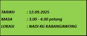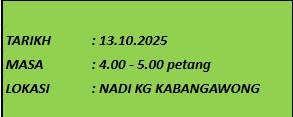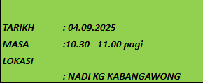 TUJUAN Tujuan aktivti ini diadakan adalah untuk membantu mengeratkan hubungan antara komuniti dan petugas NADI. Selain itu, ini juga akan menyemarakkan semangat patriotisme dalam kalangan komuniti. AKTIVITI Aktiviti ini dilaksanakan bertempat di NADI Kampung Kabangawong. Petugas NADI mempelawa mereka yang […]