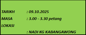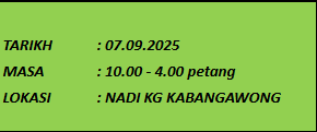 TUJUAN Kluster NADI Nabawan dijemput untuk mengikuti program ini bersama warga Pensiangan. Tujuan program ini adalah untuk membantu mengeratkan hubungan antara komuniti dan petugas NADI. Selain itu ini juga akan dapat memberikan pendedahan SARA & KIS kepada komuniti setempat. AKTIVITI […]